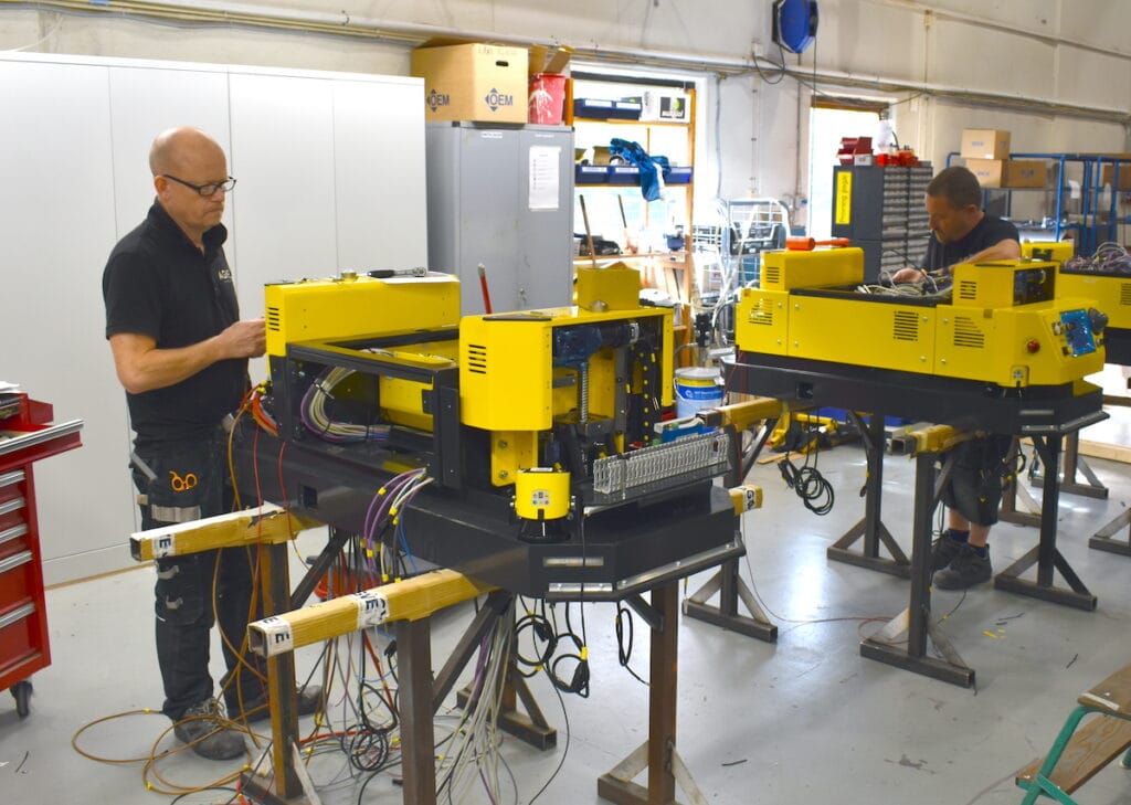 Slutsammansättningen av AGV:erna sker sedan i företagets verkstad, där tolv medarbetare monterar ihop och testar vagnarna och truckarna.
