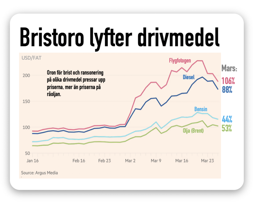 Redan börjar vi se behov av ransonering. Priset på flygfotogen och diesel är upp mest – nära 100 procent. Det är dubbelt mer än oljepriset och signalerar att en rad branscher är oroliga för brist på drivmedel. Det får bolag och länder att börja bunkra drivmedel.