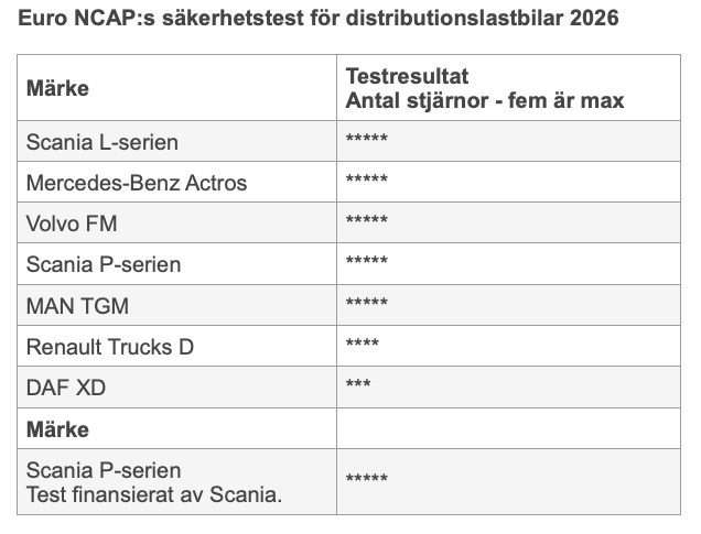 Så gick för de svenska lastbilstillverkarna i Euro NCAP:s senaste säkerhetstest.